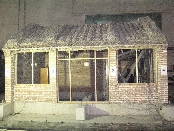 选取图8所示纪晓东等开展的单层未设防砌体结构振动台试验模型,输入典型台站记录,分析结果表明该结构将处于中度破坏状态。(纪晓东等,北京市既有农村住宅砖木结构加固前后振动台试验研究,建筑结构学报,2012,11,53-61.)