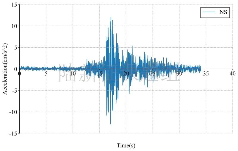 JSD0001典型台站位置北纬31.96度,东经119.94度(图1,其中红色标记为震中位置),记录到水平向地震动峰值加速度为25.26cm/s/s,竖直向地震动峰值加速度为6.60cm/s/s。该地震动及反应谱如图2、图3所示。